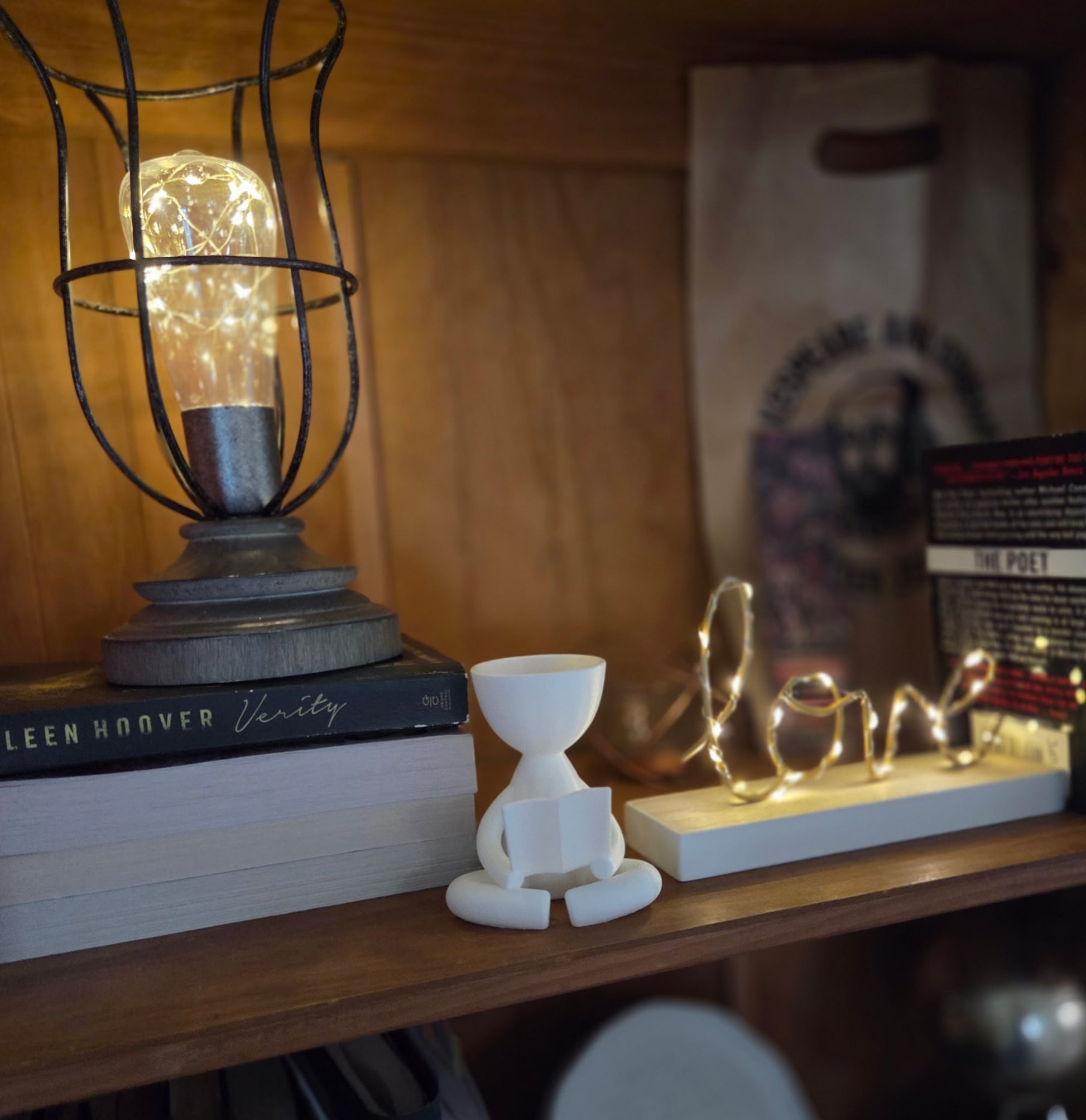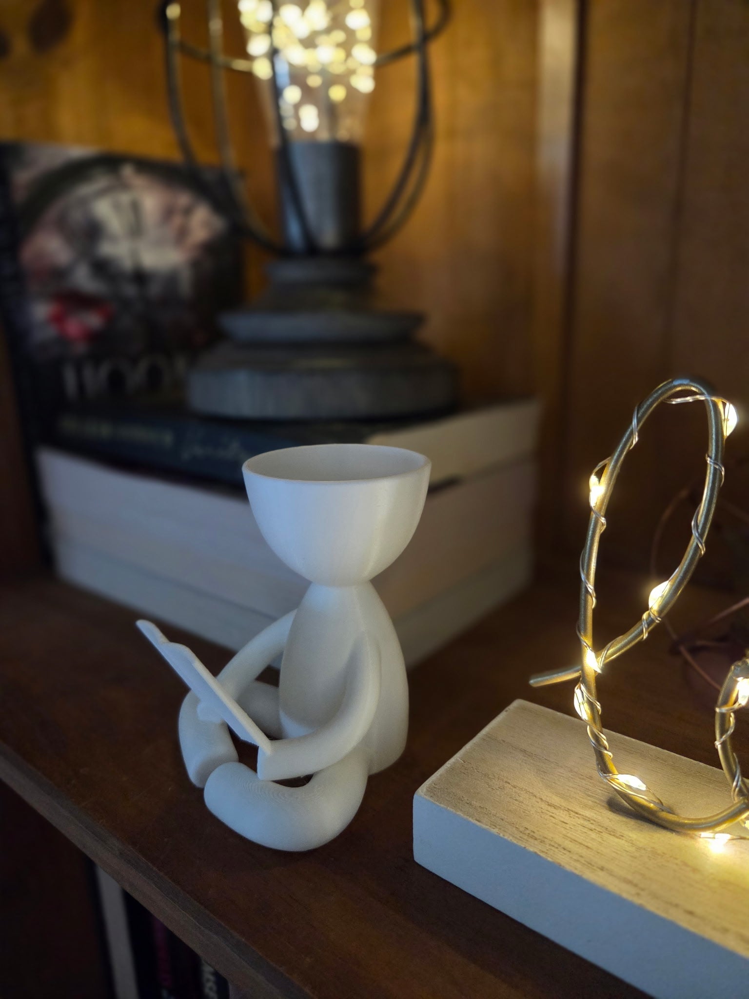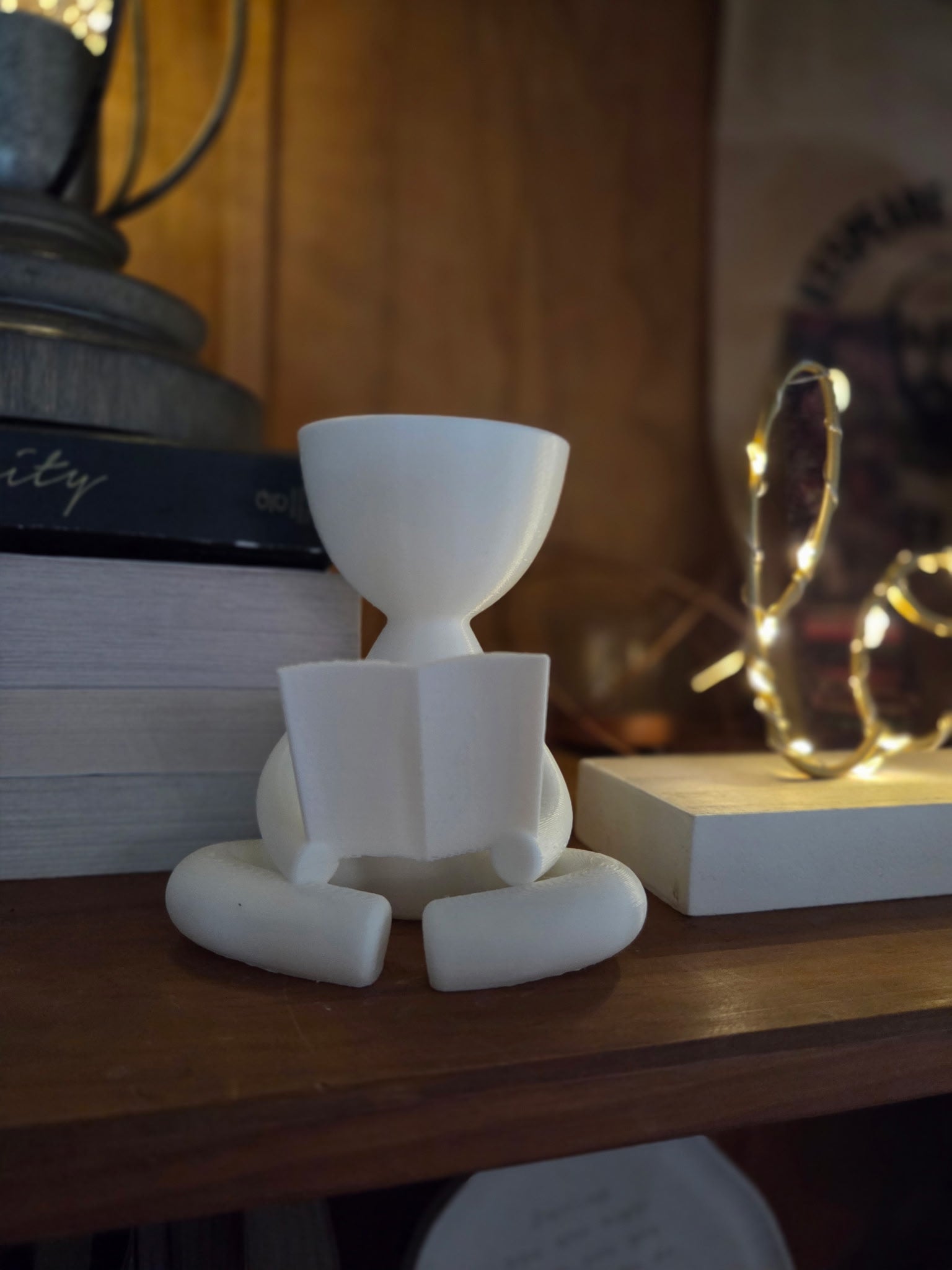 Add charm and personality to your plant display with this reading figure planter. Shaped like a seated character holding an open book, it features a bowl-shaped head perfect for small plants, succulents, or decorative accents. The minimalist white finish blends seamlessly with any decor, while the whimsical design makes it a delightful piece for bookshelves, desks, or cozy reading nooks. Perfect for plant lovers and book enthusiasts alike.