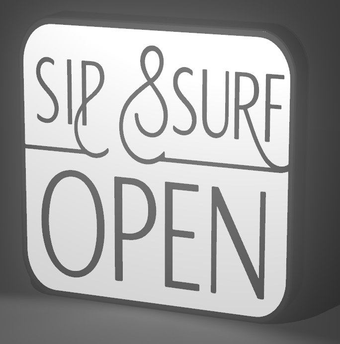 Featuring the elegant Sip & Surf logo above bold “OPEN” lettering, this eye-catching piece is perfect for windows, counters, or shelves. Designed to glow from within, it’s a functional and decorative way to create a welcoming vibe—even in low light.